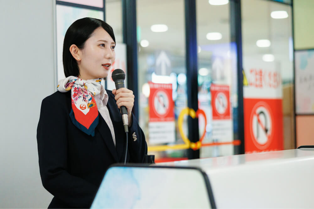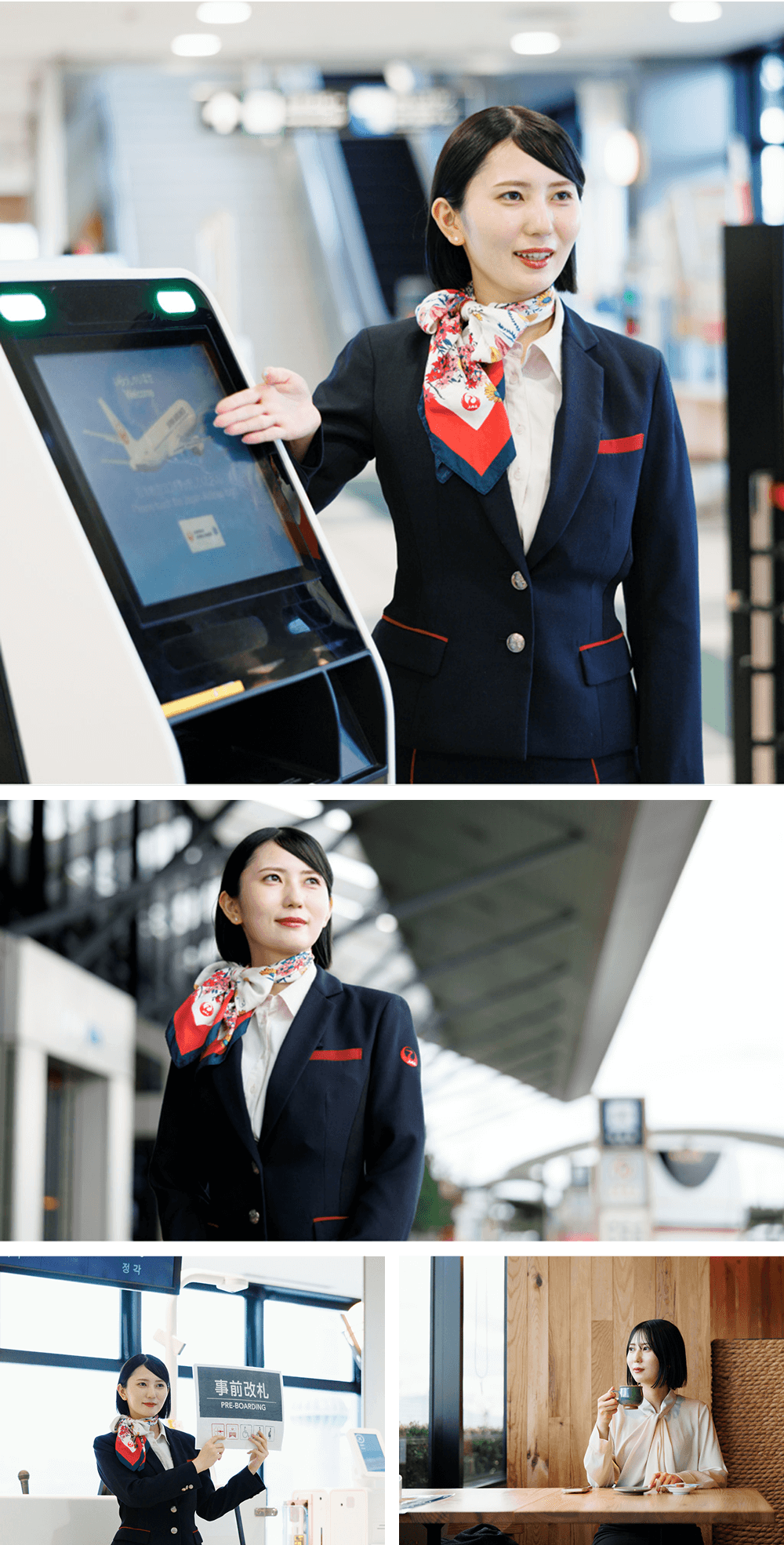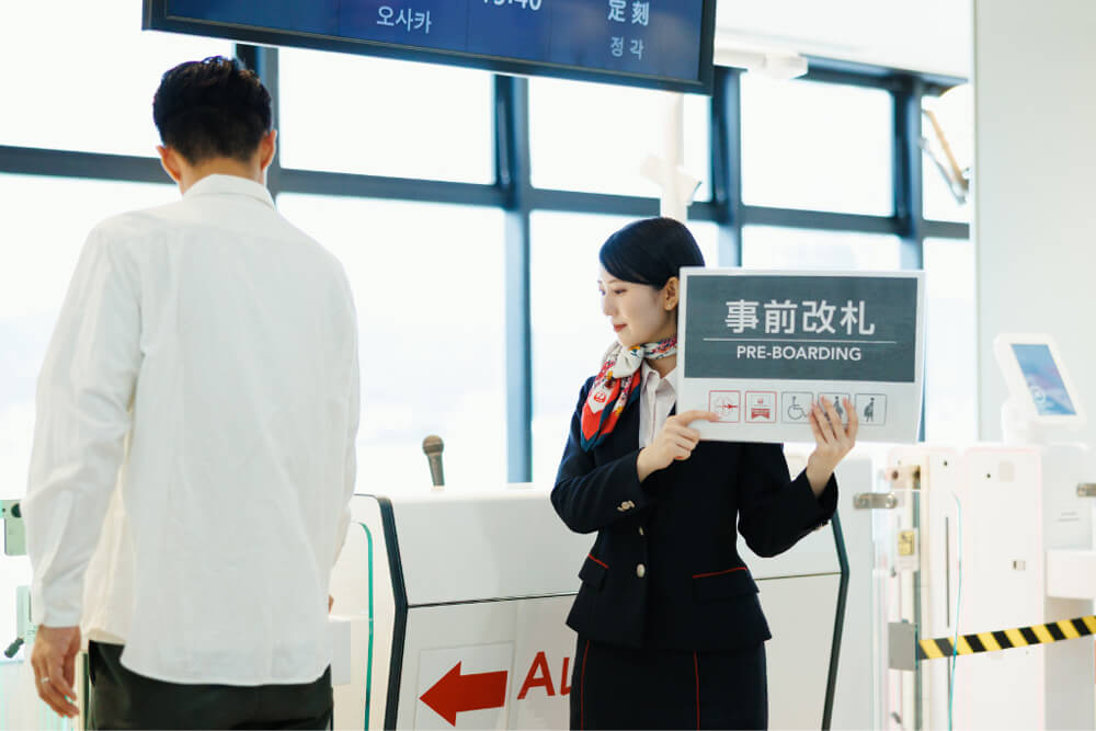 搭乗口でお客様を飛行機へとご案内。最高の「いってらっしゃい」を伝えます。温かい笑顔と丁寧な対応で、快適な空の旅の第一歩をサポートします。