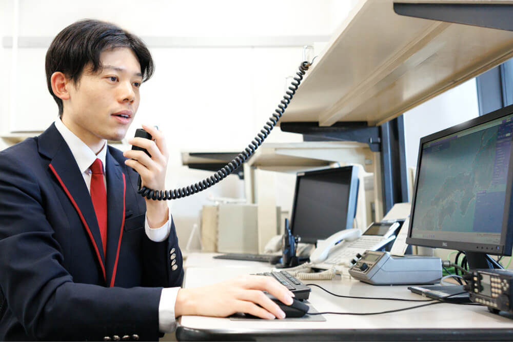 地上からパイロットをサポートし、安全なフライト運航を実現する重要な役割。飛行中の航空機に気象情報などを提供し、コックピットと連携して安全運航を支えます。国家資格「航空特殊無線技士」を取得し、専門家として活躍します。