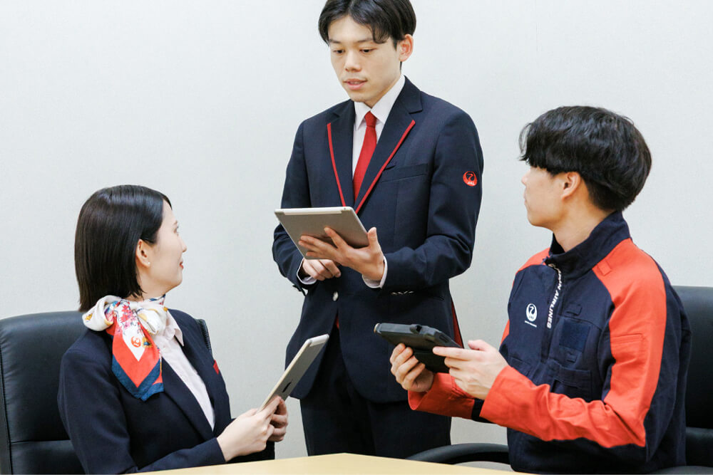 全国の仲間と学ぶ羽田空港でのJAL新入社員教育(旅客課約10日間、運送課約3日間)。現場では先輩がマンツーマンで支えるので、未経験でも安心です。
