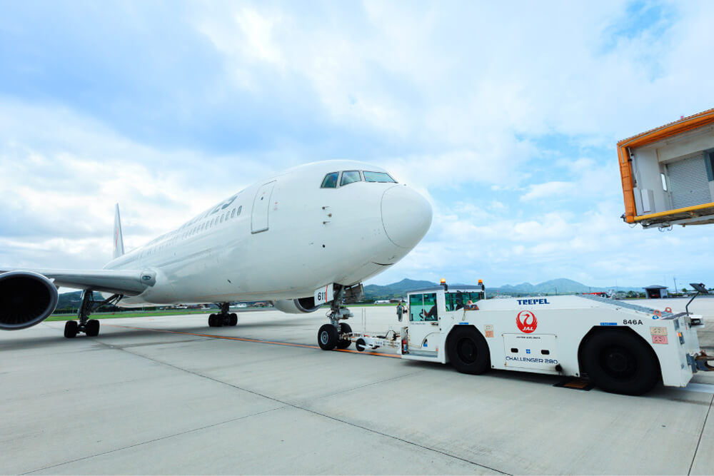 離陸前の飛行機を滑走路へ送り出す重要な任務。専用車両を操縦し、巨大な航空機を安全に押し出す、技術と責任感が求められる業務です。