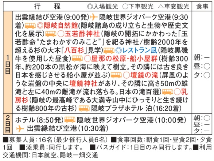 - 1日目隠岐空港からホテルまで同行します
