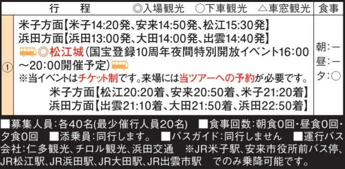 ※当コースは乗降場所限定ツアーです。JR米子駅だんだん広場前、安来市役所前バス停、JR松江駅南口、JR浜田駅、JR大田駅、JR出雲市駅でのみ乗降可能です。