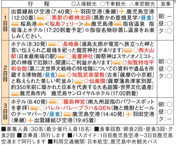 - 1日目鹿児島空港~3日目鹿児島空港まで同行します