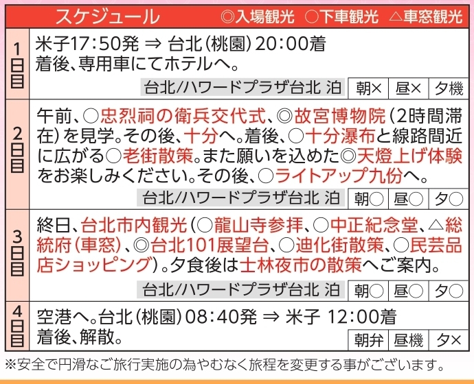 - 九份観光に関して:九份観光が土曜日にあたります。その為、バス駐車場から九份エリアまでは混載シャトルバス利用となります。予約制ではなく到着のタイミングによってお待ちいただく場合がありますので予めご了承ください。