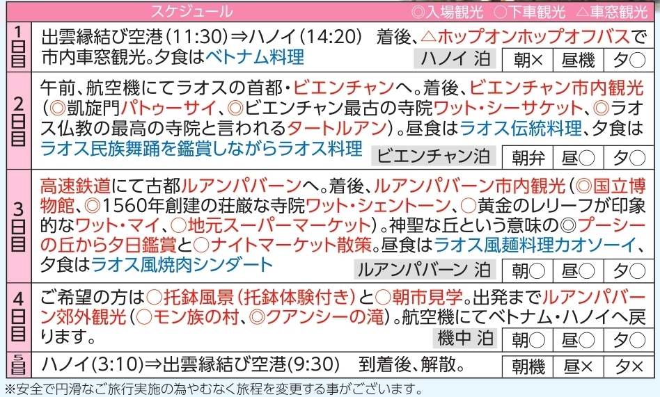 - 航空機のスケジュールは現在の最新の資料を基にしておりますが変更となる場合があります。その場合、予定のスケジュールを変更してご案内する場合がありますので予めご了承ください。確定スケジュールは出発2週間前にお渡しする旅のしおりにてご案内いたします。
