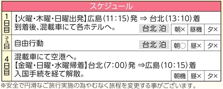 上記旅行代金には燃油サーチャージ11,800円、広島空港使用料400円、空港税2,600円、ブッキングサービスチャージ3,900円、国際観光旅客税1,000円は含まれません。別途お支払いいただきます。(2026年1月現在)原油価格の変動による設定に基づいて追加または返金します。※子供代金の設定はありません。大人と同額です。(但し、ベッドを使用しないお子様の場合はお問合せ下さい。)
