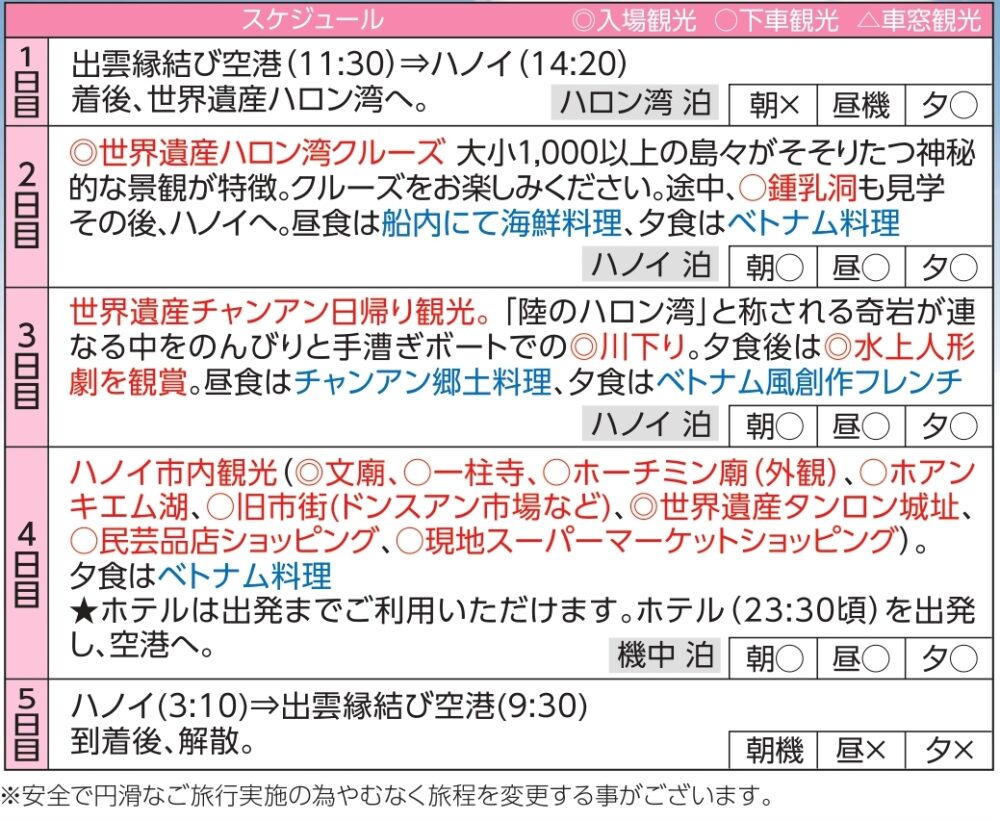 ベトナムの世界遺産、「ハロン湾」、「チャンアン」、「タンロン城址」をじっくりとお楽しみいただけるほか、ベトナムの郷土料理などグルメも充実!