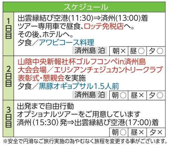 - 済州島満喫3日間、ゴルフコンペ3日間、フリープラン3日間 各コース合計130名